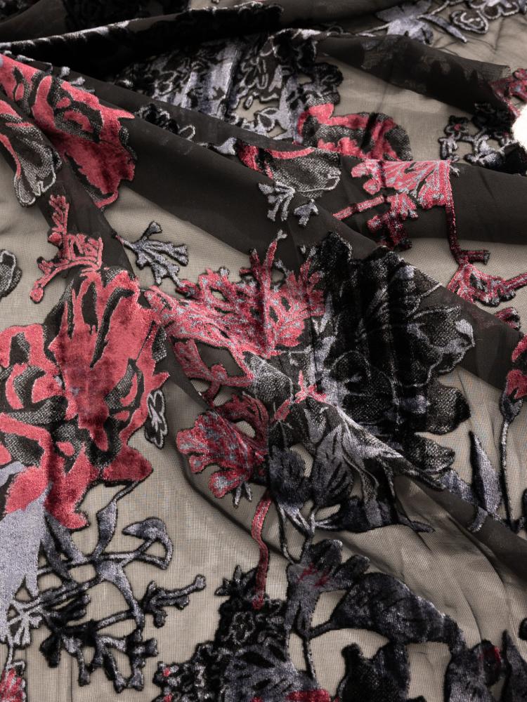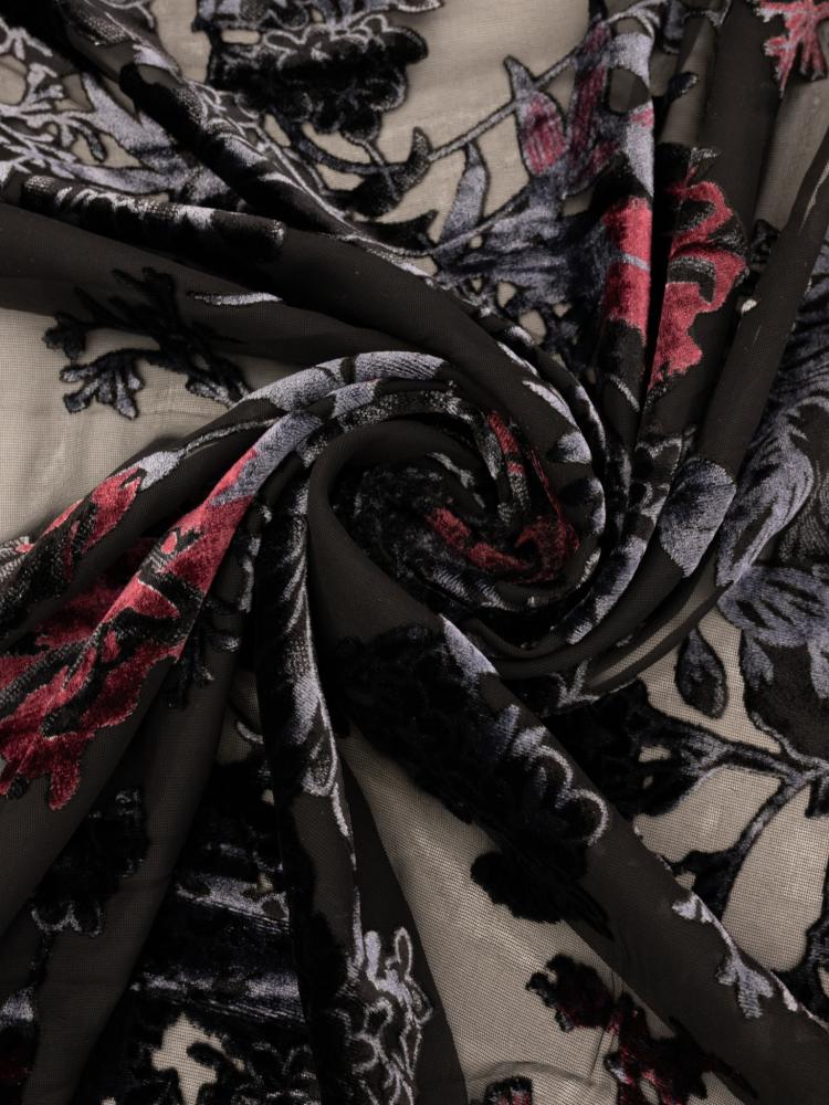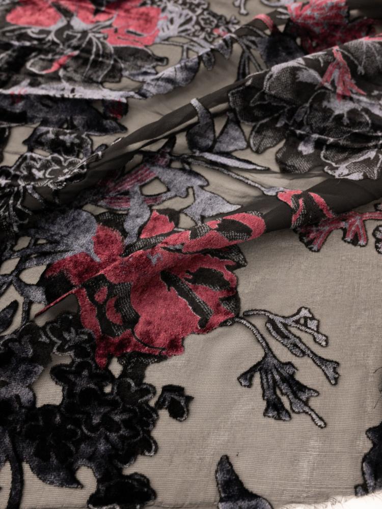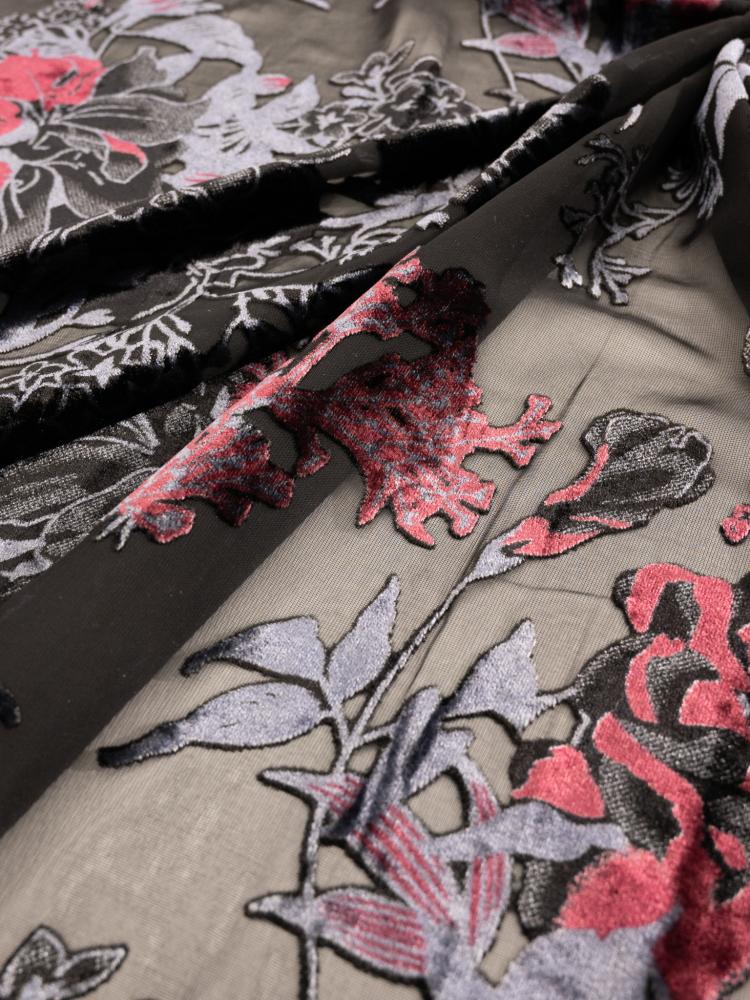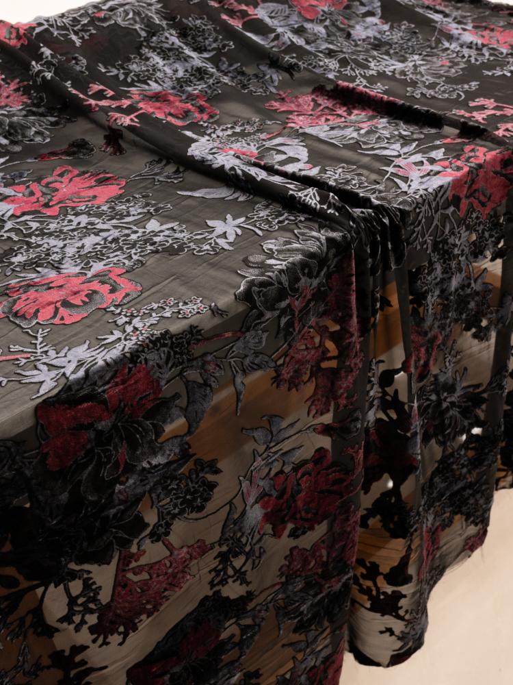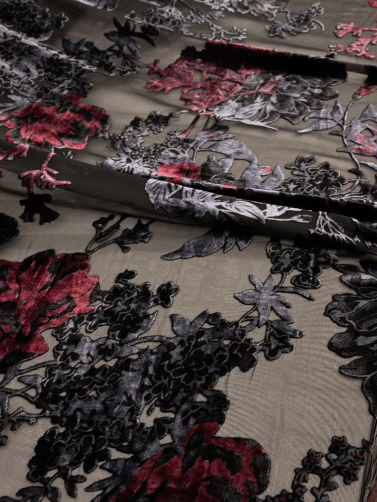 قماش شيفون مخمل يجمع بين خفة الشيفون وأناقة المخمل. يتميز بملمس ناعم وانسيابي مع لمعة فاخرة تضيف لمسة راقية على أي تصميم. القماش شفاف نسبياً مع لمسات مخملية تمنحه طابع مميز وملفت.