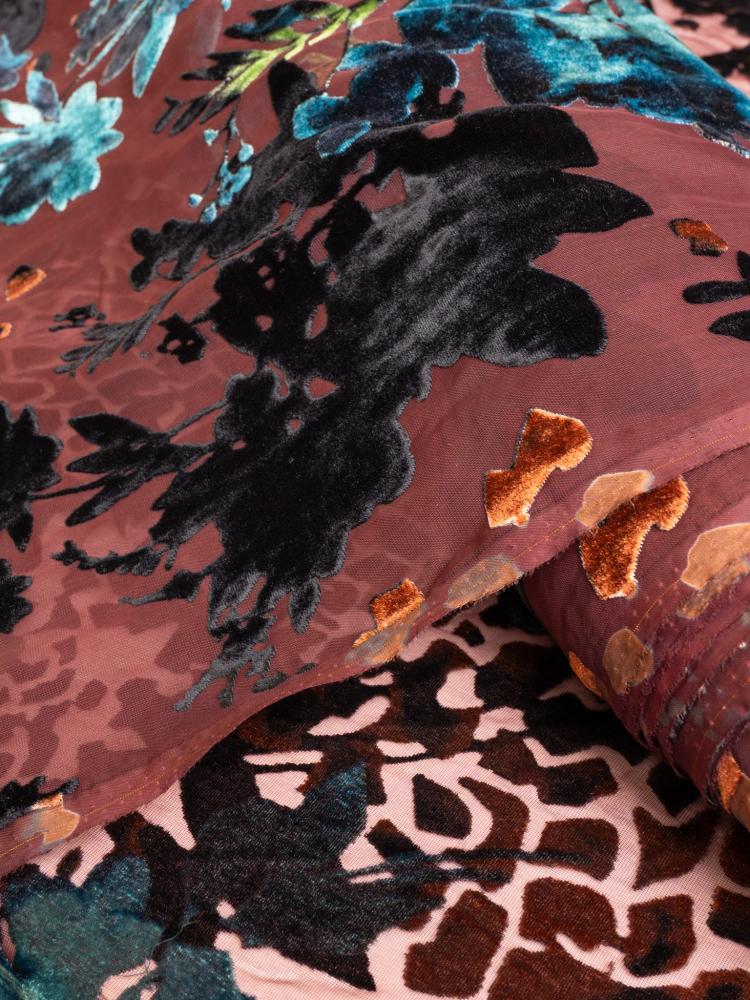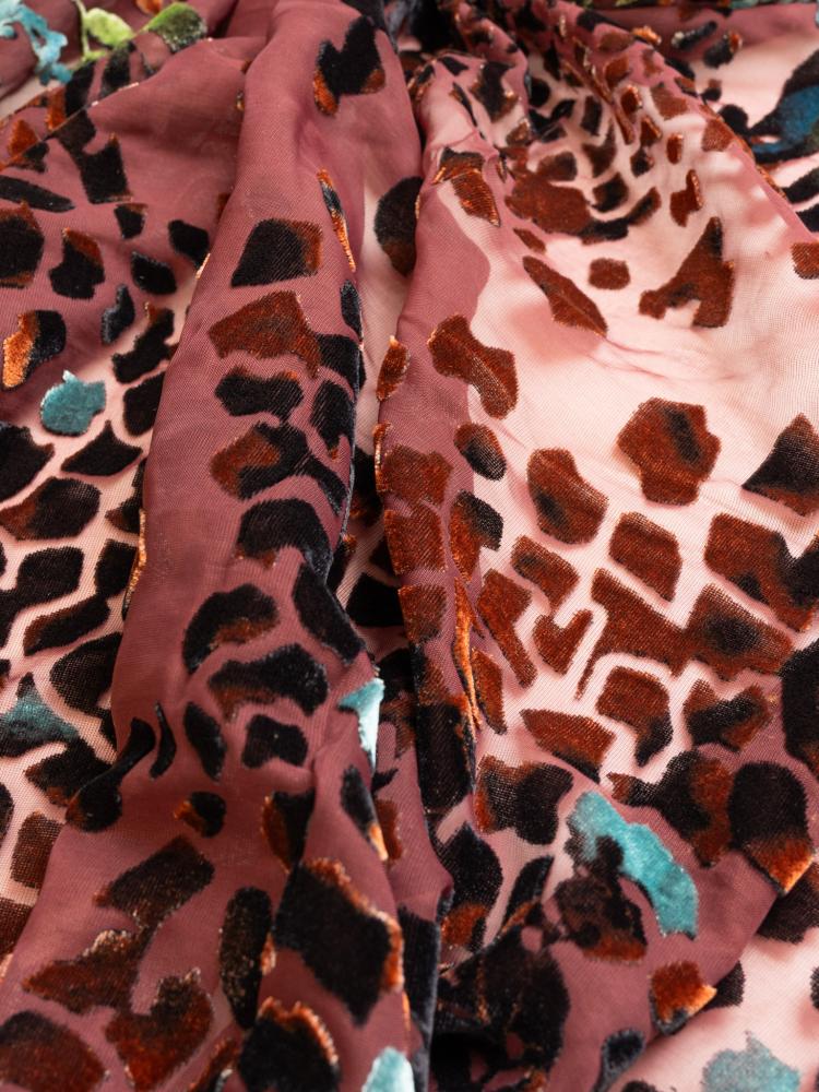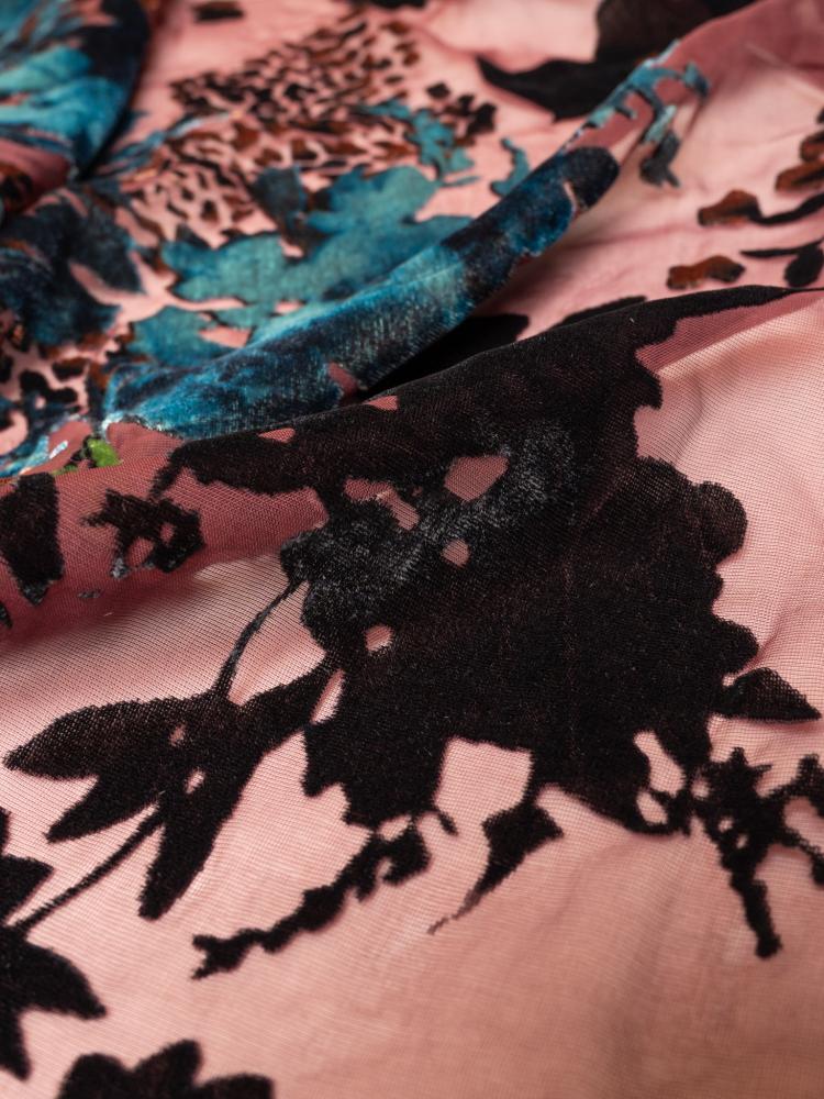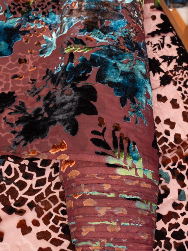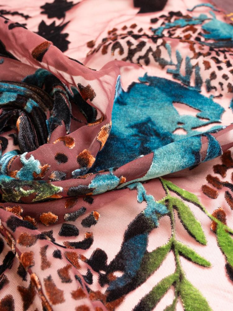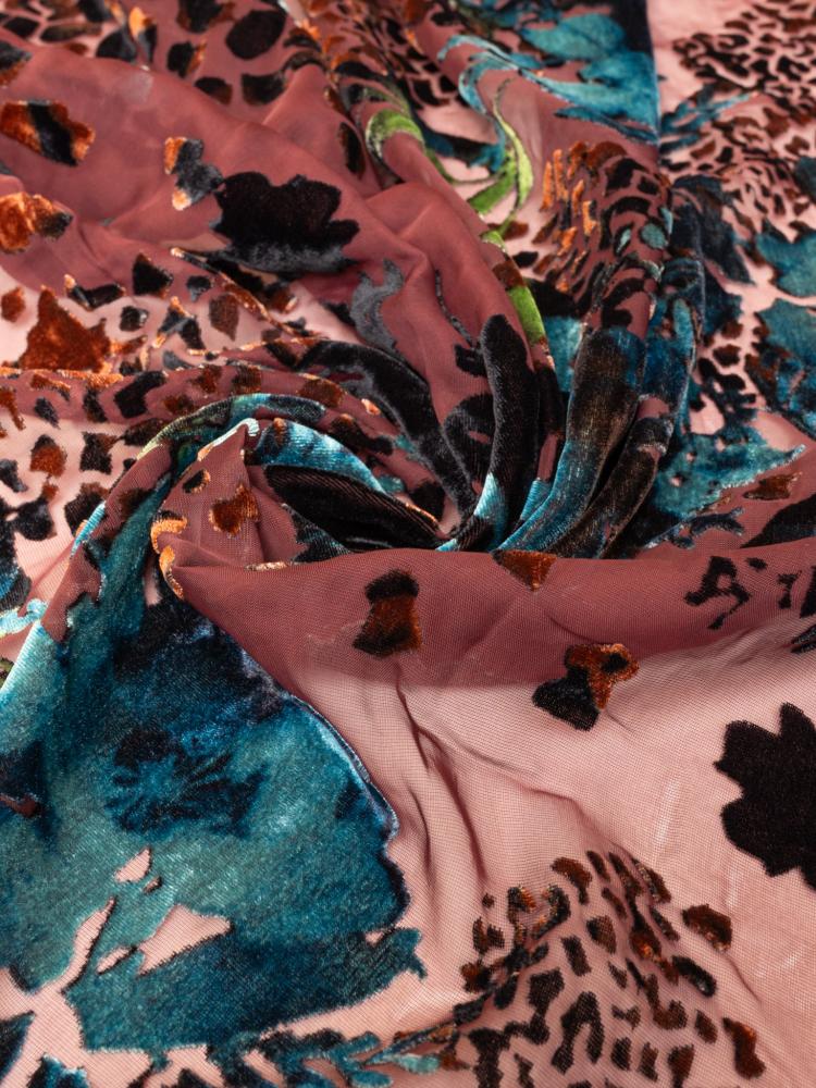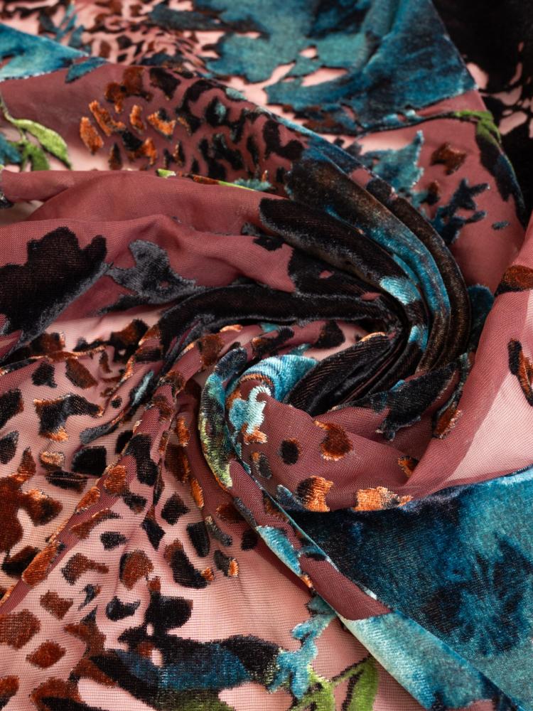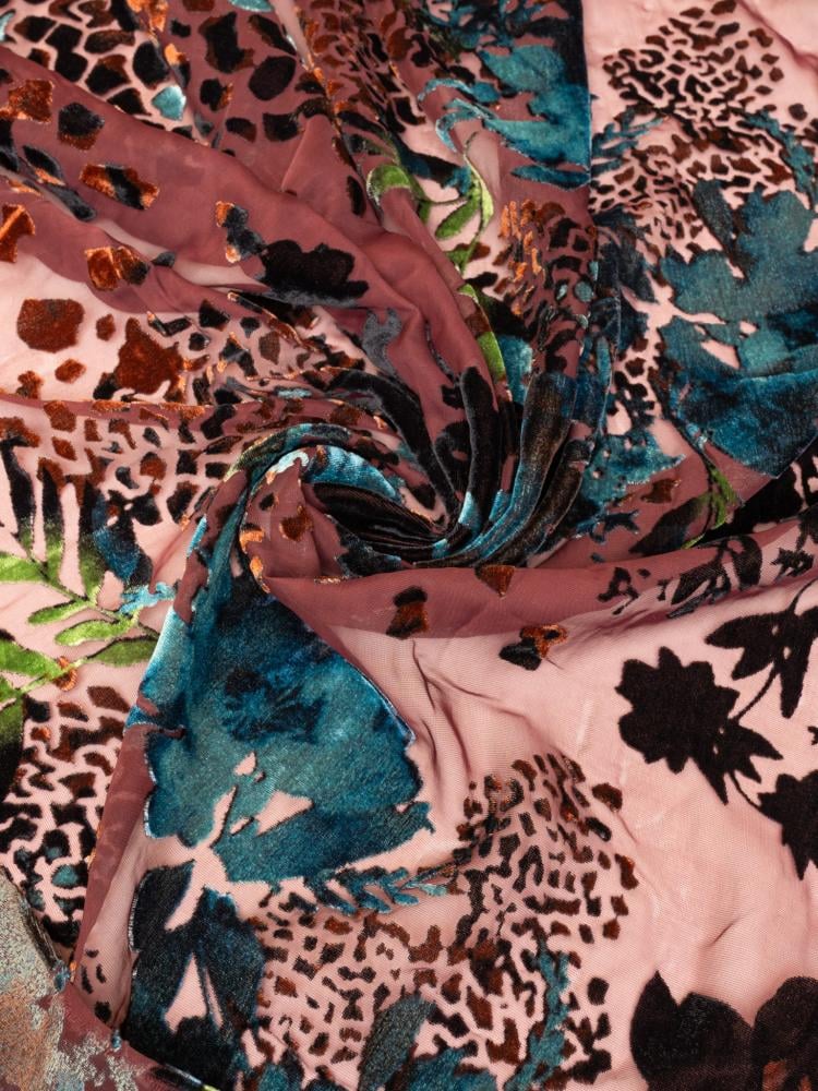 قماش شيفون مخمل يجمع بين خفة الشيفون وأناقة المخمل. يتميز بملمس ناعم وانسيابي مع لمعة فاخرة تضيف لمسة راقية على أي تصميم. القماش شفاف نسبياً مع لمسات مخملية تمنحه طابع مميز وملفت.