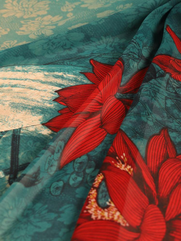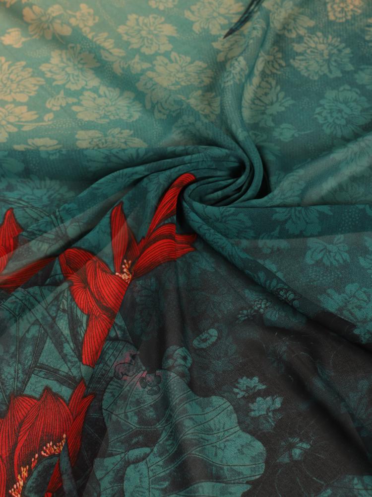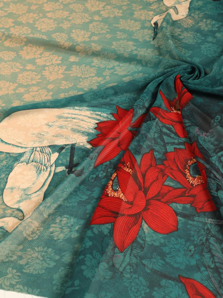 قماش شيفون خفيف وناعم بمطبوع مشجر جذاب، متوفر بعرضين ليتناسب مع مختلف التصاميم. يتميز بلمسة سيلكية وانسيابية رائعة، مما يجعله خيارًا مثاليًا للفساتين والموديلات الأنيقة.