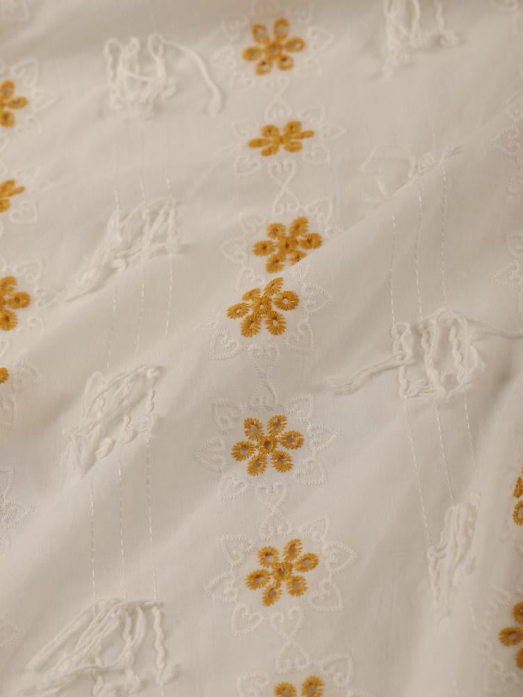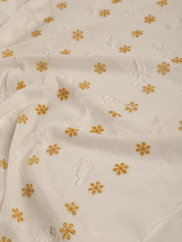 يتميز القماش بتصميم **مطرز بدقة** مع تفاصيل مخرمة أنيقة ، مما يضفي لمسة من الفخامة والجمال على أي قطعة ملابس يستخدم منه.